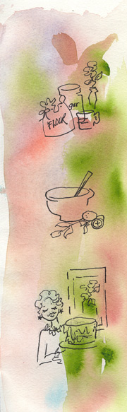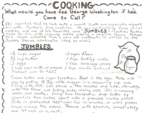 Out of the oven, I pull another batch of Jumbles [see recipe below], supposedly a favorite of George Washington, the topic of this month’s Children’s Almanac. My partner and I have been adapting and testing an heirloom recipe that just might be similar to what Martha would have prepared. The distinctive aroma is the result of caraway seeds. Within a few minutes, warm cookies on the table, I join my sons. My homework is the reading and writing for our next edition.